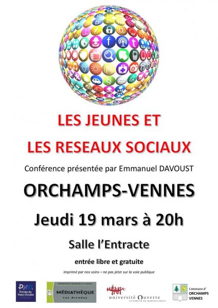 La médiathèque Les arcades vous propose une conférence « Les jeunes et les réseaux sociaux » présentée par M. Emmanuel Davoust le jeudi 19 mars à 20h à la salle l’Entracte.